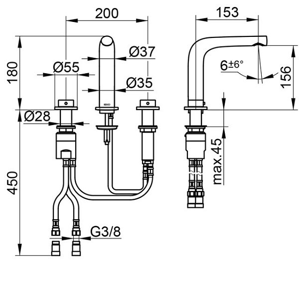 Смеситель для раковины, Keuco, Edition 400, тип открывания воды-двухвентильный, отверстия для монтажа-3, высота, мм-180, вынос излива, мм-153, цвет-хром Смеситель для раковины, Keuco, Edition 400, цвет-хром