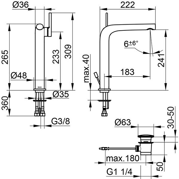 Смеситель для раковины, Keuco, Edition 400, тип открывания воды-однорычажный, отверстия для монтажа-1, высота, мм-309, вынос излива, мм-222, цвет-хром Смеситель для раковины, Keuco, Edition 400, цвет-хром
