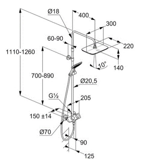 Душевая стойка, Kludi, COCKPIT Explorer, смеситель-в комплекте, тип открывания воды-вентильный, рукоятка выбора температуры с ограничителем горячей воды при 40 °C, тип регулирования воды-термостатический картридж, верхний душ-есть FRESHLINE, форма верхнего душа-прямоугольная, размер верхнего душа,мм-300*220, держатель верхнего душа-есть, вынос, мм-400, количество режимов верхнего душа-1, тип струи верхнего душа-бодрящая, размер штанги, мм-1110-1260, ручной душ-в комплекте FRESHLINE 1S, количество режимов ручного душа-1, тип струи верхнего душа-бодрящая, шланг-есть SUPARAFLEX, с металлическим эффектом, с коническими гайками, двусторонняя защита от скручивания, размер шланга, мм-1600, цвет-хром Душевая стойка, Kludi, COCKPIT Explorer, цвет-хром