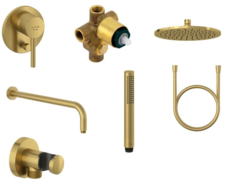 Душевой комплект, Kludi, BOZZ, смеситель-в комплекте, монтаж смесителя-настенный встраиваемый, тип открывания воды-однорычажный, тип регулирования воды-керамический картридж, внутренняя часть-в комплекте, верхний душ-есть, форма верхнего душа-круглая, размер верхнего душа,мм-300, держатель верхнего душа-есть, вынос, мм-400, количество режимов верхнего душа-1, тип струи верхнего душа-бодрящая, ручной душ-в комплекте, количество режимов ручного душа-1, тип струи ручного душа-бодрящая, шланг-есть, размер шланга, мм-1250, держатель для ручного душа-есть, шланговое подключение-есть, цвет-золото брашированное Душевой комплект, Kludi, BOZZ, 7in1, цвет-золото брашированное