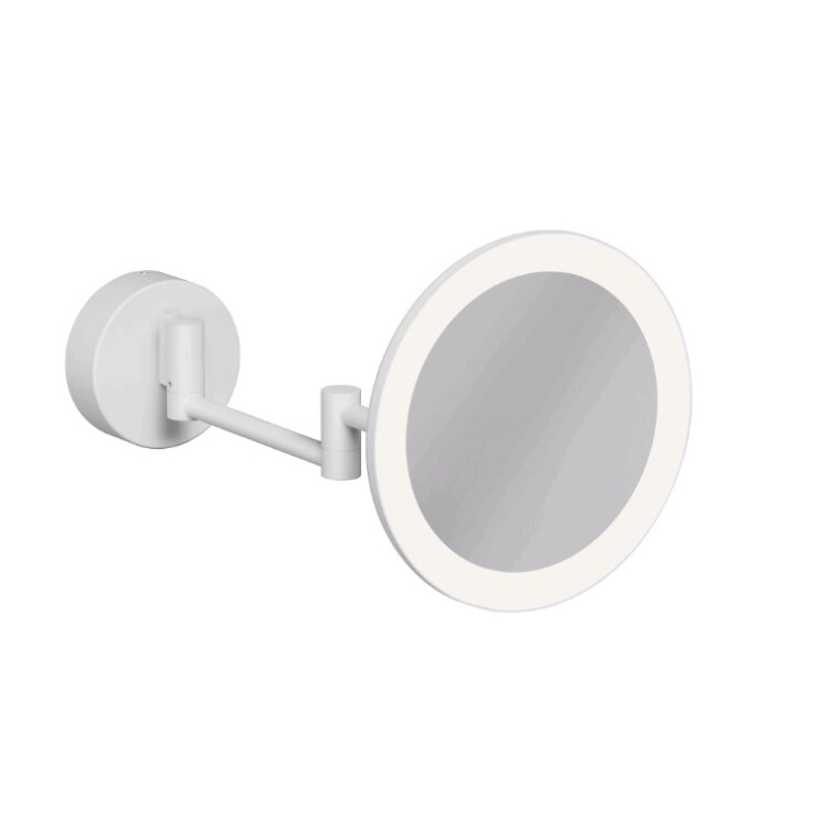 Косметическое зеркало, Kludi, VELA R, круглое, размер зеркала (ш x в), мм-202*202, глубина с держателем,мм-103-404, тип установки-настенный, с подсветкой, 2 переключателя с регулируемой цветовой температурой 3000 К или 5700 К на задней панели, увеличение, х-3 раза, материал рамы-металл, цвет-белый матовый Косметическое зеркало, Kludi, VELA R, с подсветкой, цвет-белый матовый