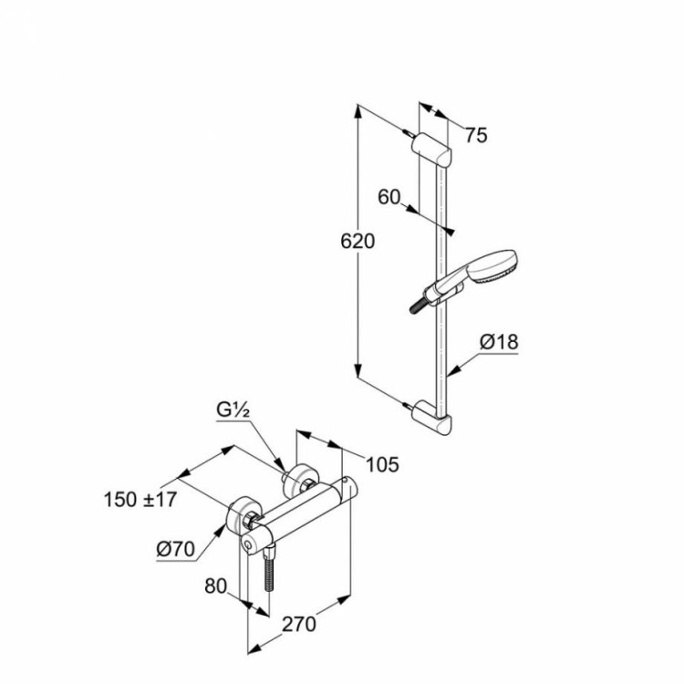 Смеситель для душа, Kludi, LOGO, тип регулирования воды-термостатический картридж, монтаж-настенный, штанга-620 мм, ручной душ-есть, шланг-1600 мм, цвет-хром Смеситель для душа, Kludi, LOGO, цвет-хром
