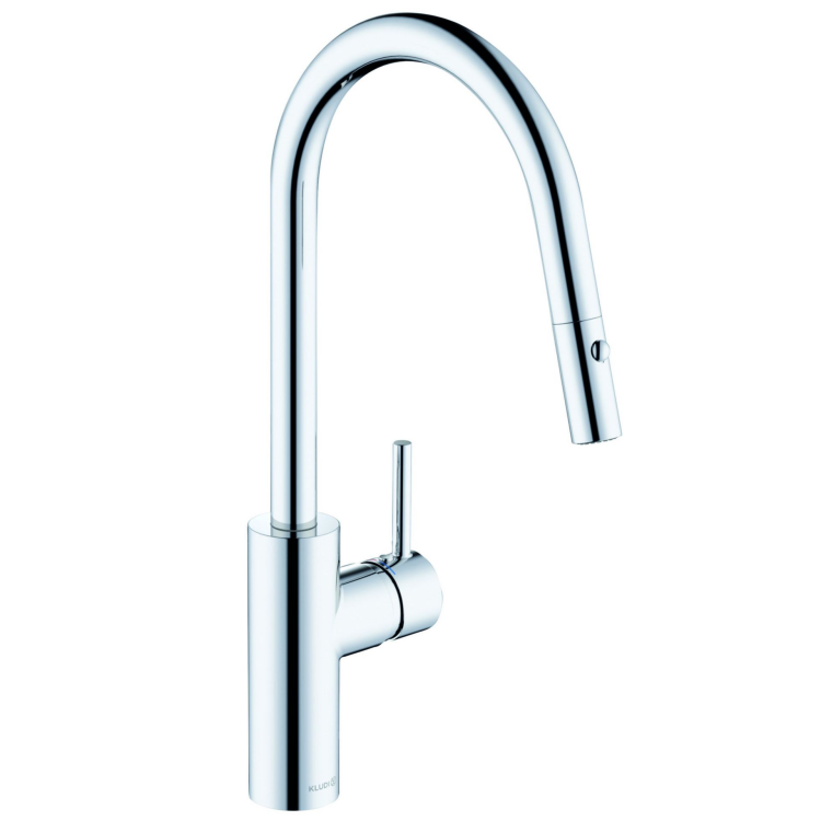 Смеситель для кухни, Kludi, E-GO Voice, тип открывания воды-однорычажный, тип регулирования воды-электронный датчик, монтаж-на раковину/столешницу, отверстия для монтажа-1, высота, мм-430, вынос излива, мм-215, тип излива-поворотный, тип подводки-гибкая, стандарт подвода воды-1/2" x 3/8", автоматический переключатель душ/нормальная струя, коробка подключения воды IP53, электронный модуль управления, питание от сети 230V, клапан защиты от обратного потока, прокладки с сеточкой, термическая дезинфекция max. 70°C, активация через приложение, цвет-хром Смеситель для кухни, Kludi, E-GO Voice, цвет-хром