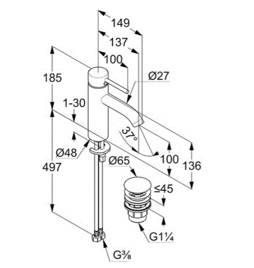 Смеситель для раковины, Kludi, BOZZ, тип открывания воды-однорычажный, тип регулирования воды-керамический картридж, монтаж-на раковину/столешницу, отверстия для монтажа-1, высота, мм-185, вынос излива, мм-135, тип излива-неподвижный, донный клапан-есть, тип подводки-гибкая, стандарт подвода воды-3/8", цвет-белый матовый Смеситель для раковины, Kludi, BOZZ, цвет-белый матовый