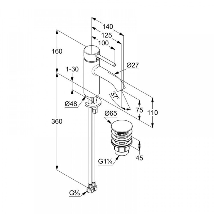Смеситель для раковины, Kludi, BOZZ, тип открывания воды-однорычажный, тип регулирования воды-керамический картридж, монтаж-на раковину/столешницу, отверстия для монтажа-1, высота, мм-160, вынос излива, мм-125, донный клапан-есть, тип подводки-гибкая, стандарт подвода воды-3/8", цвет-хром Смеситель для раковины, Kludi, BOZZ, цвет-хром
