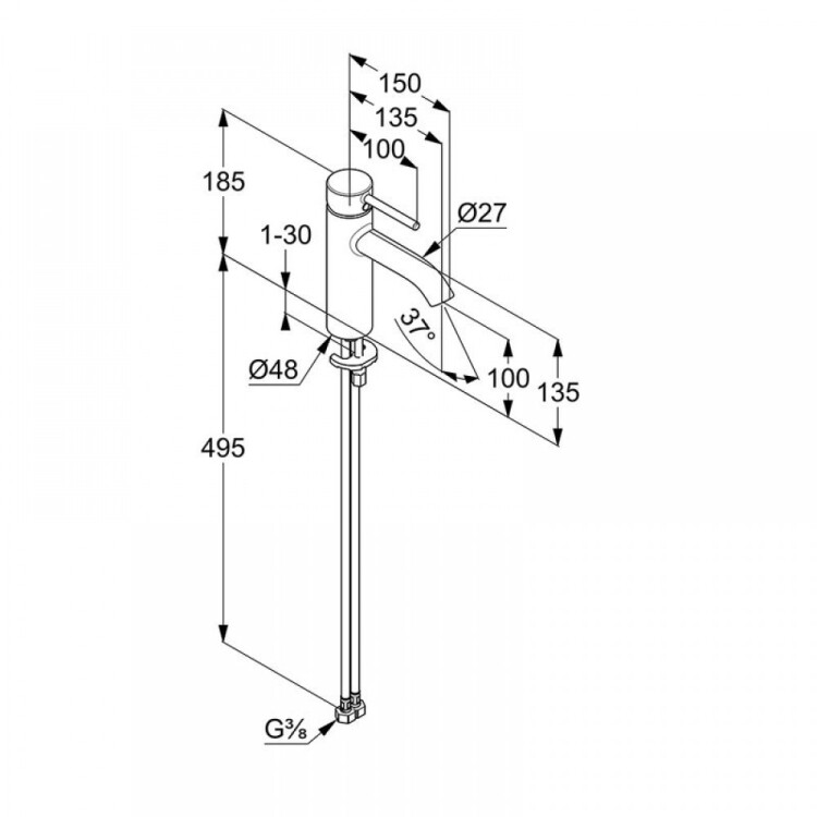Смеситель для раковины, Kludi, BOZZ, тип открывания воды-однорычажный, тип регулирования воды-керамический картридж, монтаж-на раковину/столешницу, отверстия для монтажа-1, высота, мм-185, вынос излива, мм-135, тип излива-неподвижный, донный клапан-отсутствует, тип подводки-гибкая, стандарт подвода воды-3/8", цвет-хром Смеситель для раковины, Kludi, BOZZ, цвет-хром
