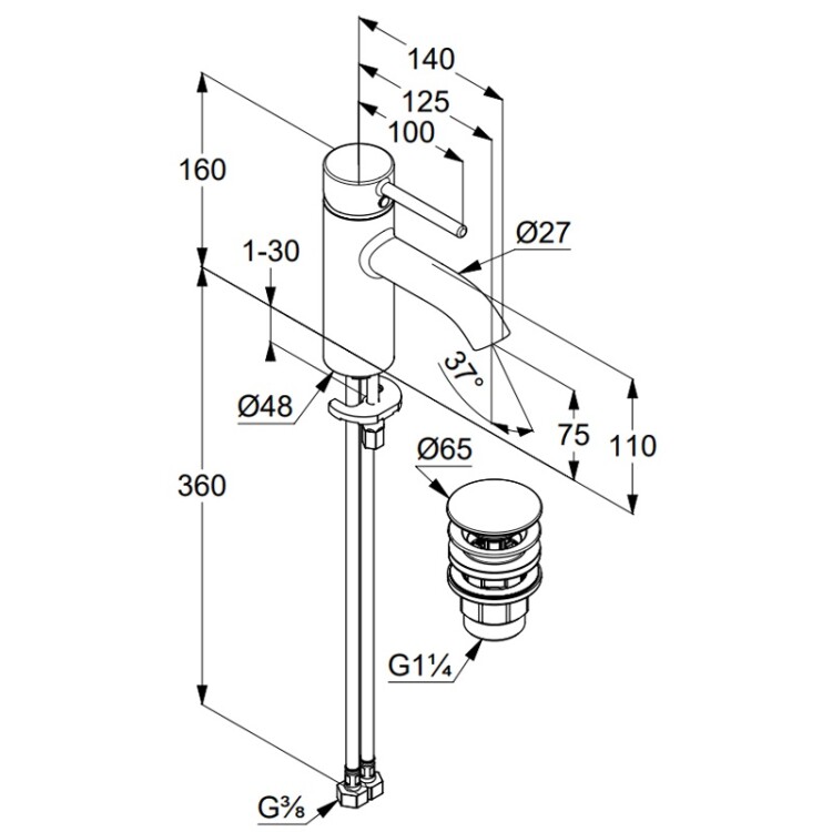 Смеситель для раковины, Kludi, BOZZ, тип открывания воды-однорычажный, тип регулирования воды-керамический картридж, монтаж-на раковину/столешницу, отверстия для монтажа-1, высота, мм-160, вынос излива, мм-125, тип излива-неподвижный, донный клапан-есть, тип подводки-гибкая, стандарт подвода воды-3/8", цвет-золото брашированное Смеситель для раковины, Kludi, BOZZ, цвет-золото брашированное