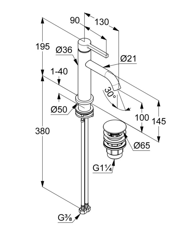 Смеситель для раковины, Kludi, Nova Fonte Pura, тип открывания воды-однорычажный, тип регулирования воды-керамический картридж, монтаж-на раковину/столешницу, отверстия для монтажа-1, высота, мм-195, вынос излива, мм-130, тип излива-неподвижный, донный клапан-есть, тип подводки-гибкая, стандарт подвода воды-3/8", цвет-хром Смеситель для раковины, Kludi, Nova Fonte Pura, цвет-хром