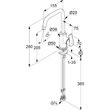 Смеситель для раковины, Kludi, Pure&Solid, тип открывания воды-однорычажный, тип регулирования воды-керамический картридж, монтаж-на раковину/столешницу, отверстия для монтажа-1, высота, мм-280, вынос излива, мм-155, тип излива-поворотный, донный клапан-отсутствует, тип подводки-гибкая, стандарт подвода воды-3/8", цвет-хром Смеситель для раковины, Kludi, Pure&Solid, цвет-хром