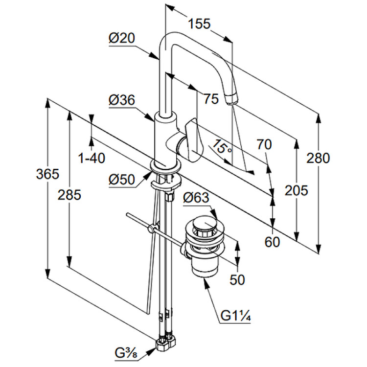 Смеситель для раковины, Kludi, Pure&Solid, тип открывания воды-однорычажный, тип регулирования воды-керамический картридж, монтаж-на раковину/столешницу, отверстия для монтажа-1, высота, мм-280, вынос излива, мм-155, тип излива-поворотный, донный клапан-есть, тип подводки-гибкая, стандарт подвода воды-3/8", цвет-хром Смеситель для раковины, Kludi, Pure&Solid, цвет-хром