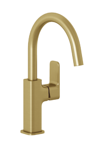 Смеситель для раковины, Kludi, Renon, тип открывания воды-однорычажный, тип регулирования воды-керамический картридж, монтаж-на раковину/столешницу, отверстия для монтажа-1, высота, мм-290, вынос излива, мм-170, тип излива-поворотный, донный клапан-отсутствует, тип подводки-гибкая, стандарт подвода воды-3/8", цвет-золото брашированное Смеситель для раковины, Kludi, Renon, цвет-золото брашированное