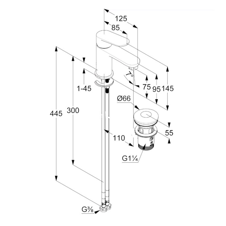 Смеситель для раковины, Kludi, X1, тип открывания воды-однорычажный, тип регулирования воды-керамический картридж, монтаж-на раковину/столешницу, отверстия для монтажа-1, высота, мм-145, вынос излива, мм-110, тип излива-неподвижный, донный клапан-есть, тип подводки-гибкая, стандарт подвода воды-3/8", цвет-черный матовый Смеситель для раковины, Kludi, X1, цвет-черный матовый