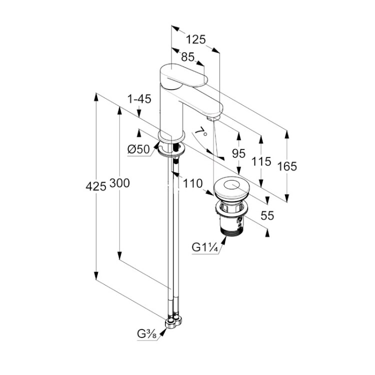 Смеситель для раковины, Kludi, X1, тип открывания воды-однорычажный, тип регулирования воды-керамический картридж, монтаж-на раковину/столешницу, отверстия для монтажа-1, высота, мм-165, вынос излива, мм-110, тип излива-неподвижный, донный клапан-есть, тип подводки-гибкая, стандарт подвода воды-3/8", цвет-хром Смеситель для раковины, Kludi, X1, цвет-хром