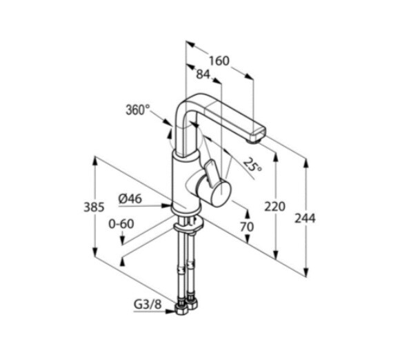 Смеситель для раковины, Kludi, ZENTA, тип открывания воды-однорычажный, управление сбоку, тип регулирования воды-керамический картридж, монтаж-на раковину/столешницу, отверстия для монтажа-1, высота, мм-244, вынос излива, мм-160, тип излива-поворотный 360°, донный клапан-отсутствует, тип подводки-гибкая, стандарт подвода воды-3/8", цвет-хром Смеситель для раковины, Kludi, ZENTA, цвет-хром