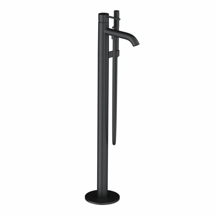 Смеситель для ванны и душа, Kludi, BOZZ, тип открывания воды-однорычажный, тип регулирования воды-керамический картридж, монтаж-напольный, отверстия для монтажа-1, вынос излива, мм-225, тип излива-неподвижный, ручной душ-в комплекте, шланг-есть, длина шланга,мм-1250, автоматический переключатель душ/ванна, внутренняя часть-необходимо заказать, цвет-черный матовый Смеситель для ванны и душа, Kludi, BOZZ, цвет-черный матовый