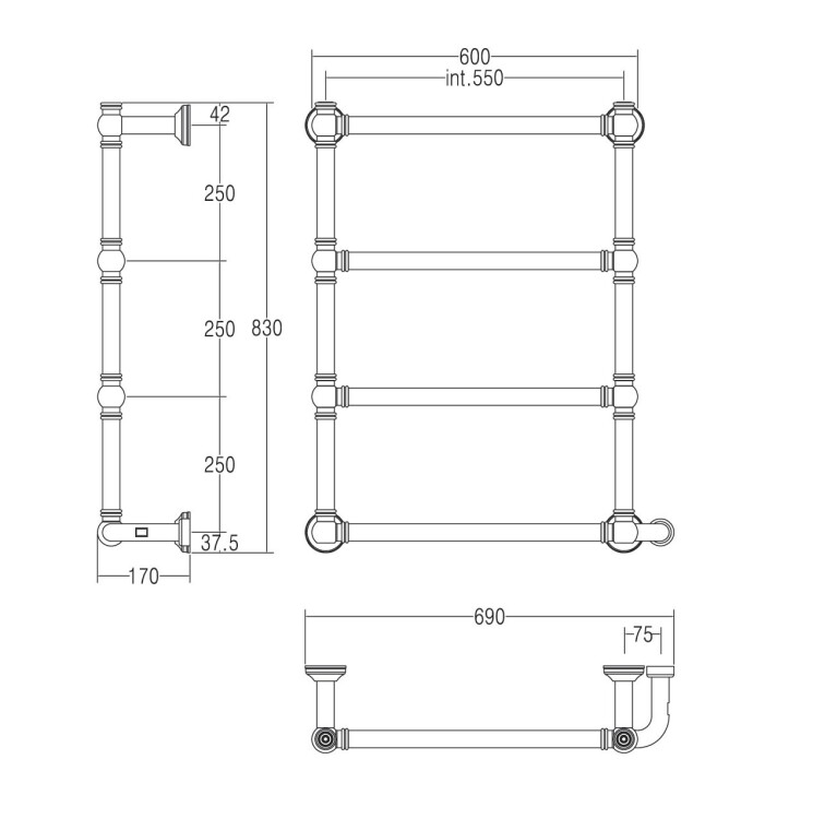 Полотенцесушитель, Margaroli, Armonia, 9-512, электрический, ширина, мм-625, глубина, мм-166, высота, мм-829, межосевое расстояние-550, подключение-Box, мощность, Вт-100, материал-латунь, цвет-хром Полотенцесушитель, Margaroli, Armonia, 9-512, шгв 625*166*829, Box, цвет-хром