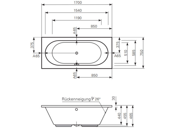 Ванна, Mauersberger, Ausana, ширина, мм-1700, глубина, мм-750, высота, мм-440, водоизмещение (л)-140, форма-овальная, диаметр слива, мм-52, материал-акрил, цвет-белый Ванна, Mauersberger, Ausana, шгв 1700*750*440, цвет-белый