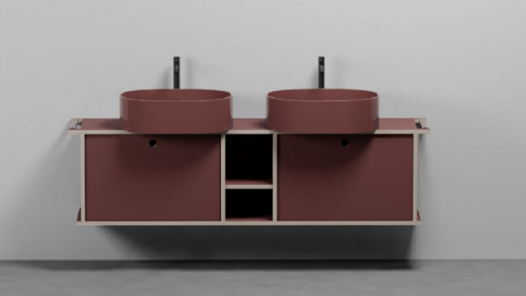 Тумба под раковину, CIELO, Theo, ширина, мм-1750, глубина, мм-380, высота, мм-470, тип установки-подвесной/напольный, ножки для напольного монтажа-необходимо заказать, раковина-необходимо заказать, вырез под раковину-два, монтаж раковины-накладной, вырез под смеситель-два, столешница-в комплекте, дверцы-2, с открытой полкой, полотенцедержатель на край столешницы-2 необходимо заказать, материал корпуса-Fenix, материал фасада-Fenix, цвет-Carminio Тумба под раковину, CIELO, Theo, шгв 1750*380*470, с вырезами под смеситель, с открытой полкой, раковина-необходимо заказать, цвет-Carminio