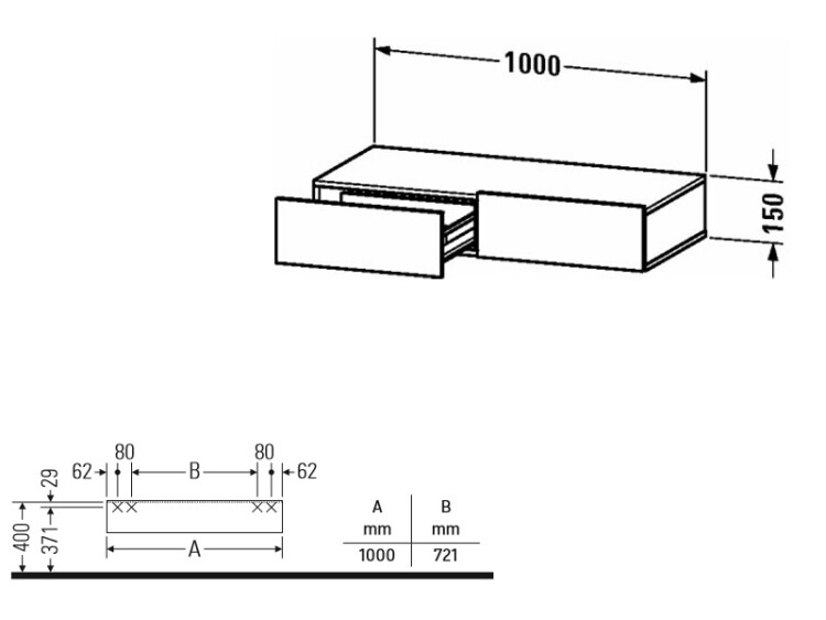 Тумба, Duravit, Durastyle, ширина, мм-1000, глубина, мм-440, высота, мм-150, тип установки-подвесной, форма мебели-прямоугольная, ящики-2, открывание-выдвижное, крепления в комплекте, материал корпуса-ДСП меламиновая смола, материал фасада-ДСП меламиновая смола, цвет-белый глянцевый, максимальная нагрузка-150 кг Тумба, Duravit, Durastyle, шгв 1000*440*150, цвет-белый глянцевый
