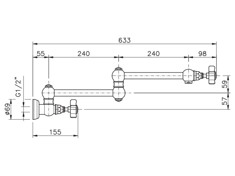 Кран, Nicolazzi, Dames Anglaises, для холодной воды, с запорным вентилем, тип открывания воды-вентильный, тип регулирования воды-керамический картридж, монтаж-настенный, отверстия для монтажа-1, высота, мм-116, вынос излива, мм-535, вид ручки-18 Dames Anglaises, стандарт подвода воды-1/2", цвет-хром Кран, Nicolazzi, Dames Anglaises, цвет-хром