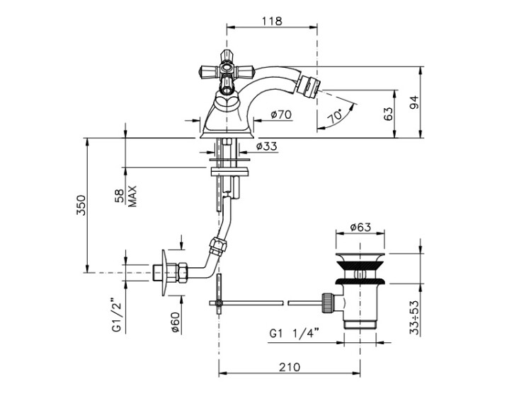 Смеситель для биде, Nicolazzi, Teide Four, тип открывания воды-двухвентильный, тип регулирования воды-керамический картридж, отверстия для монтажа-1, высота, мм-94, вынос излива, мм-118, вид ручки-45 Teide Four, донный клапан-есть, цвет-Bronzed Plated Смеситель для биде, Nicolazzi, Teide Four, цвет-Bronzed Plated