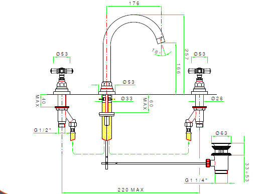 Смеситель для раковины, Nicolazzi, Agora, тип открывания воды-вентильный, тип регулирования воды-керамическая кран-букса, монтаж-на раковину/столешницу, отверстия для монтажа-3, высота, мм-257, вынос излива, мм-176, донный клапан-есть, цвет-золото (Gold, Polished Gold) Смеситель для раковины, Nicolazzi, Agora, цвет-золото (Gold, Polished Gold)