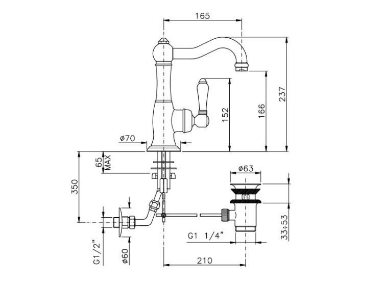 Смеситель для раковины, Nicolazzi, El Capitan, тип открывания воды-однорычажный, отверстия для монтажа-1, высота, мм-237, вынос излива, мм-165, вид ручки-75C El Capitan, донный клапан-есть, цвет-Bronzed Plated, слив-автоматический Смеситель для раковины, Nicolazzi, El Capitan, цвет-Bronzed Plated