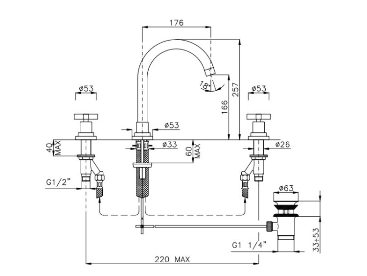 Смеситель для раковины, Nicolazzi, Mac Kinley 05, тип открывания воды-двухрычажный, тип регулирования воды-керамический картридж, отверстия для монтажа-3, высота, мм-257, вынос излива, мм-176, вид ручки-29 Mac Kinley 05, донный клапан-есть, слив-автоматический, цвет-хром Смеситель для раковины, Nicolazzi, Mac Kinley 05, цвет-хром