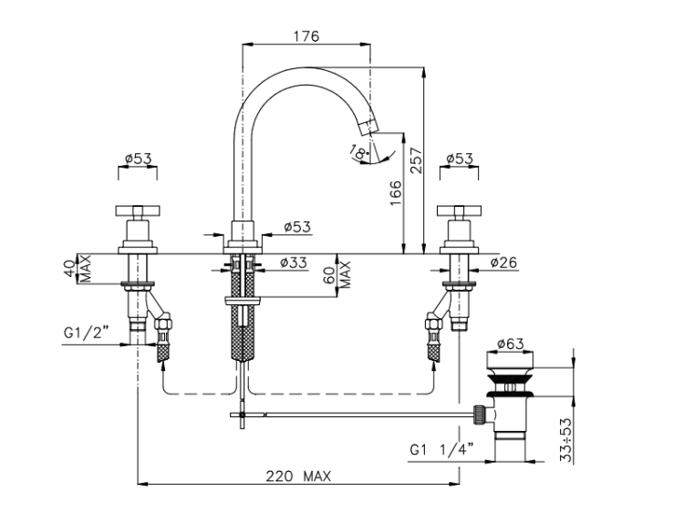 Смеситель для раковины, Nicolazzi, Mac Kinley 05, тип открывания воды-двухвентильный, отверстия для монтажа-3, высота, мм-257, вынос излива, мм-176, вид ручки-29 Mac Kinley 05, донный клапан-есть, цвет-Polished Nickel Смеситель для раковины, Nicolazzi, Mac Kinley 05, цвет-Polished Nickel