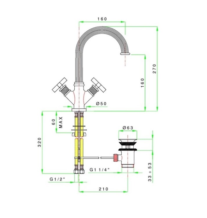 Смеситель для раковины, Nicolazzi, Pantheon, тип открывания воды-вентильный, тип регулирования воды-керамическая кран-букса, монтаж-на раковину/столешницу, отверстия для монтажа-1, высота, мм-270, вынос излива, мм-160, тип излива-поворотный, донный клапан-есть, тип подводки-гибкая, стандарт подвода воды-1/2", цвет-хром Смеситель для раковины, Nicolazzi, Pantheon, цвет-хром