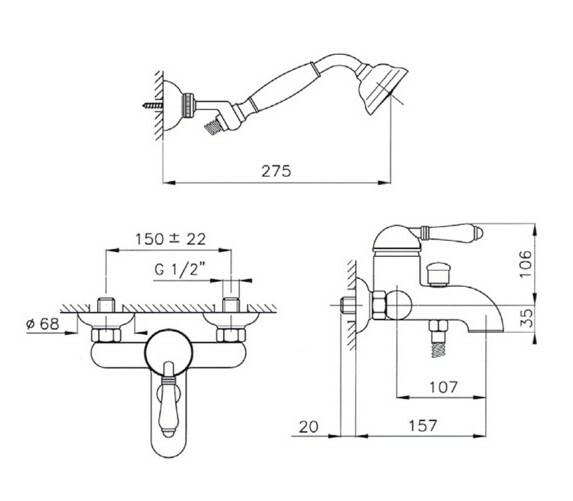 Смеситель для ванны и душа, Nicolazzi, El Capitan, тип открывания воды-однорычажный, тип регулирования воды-керамический картридж, тип установки-настенный, отверстия для монтажа-2, вынос излива, мм-107, материал ручки-металл, цвет ручки-бронза, комплектация-ручной душ, цвет-бронза Смеситель для ванны и душа, Nicolazzi, El Capitan, цвет-бронза