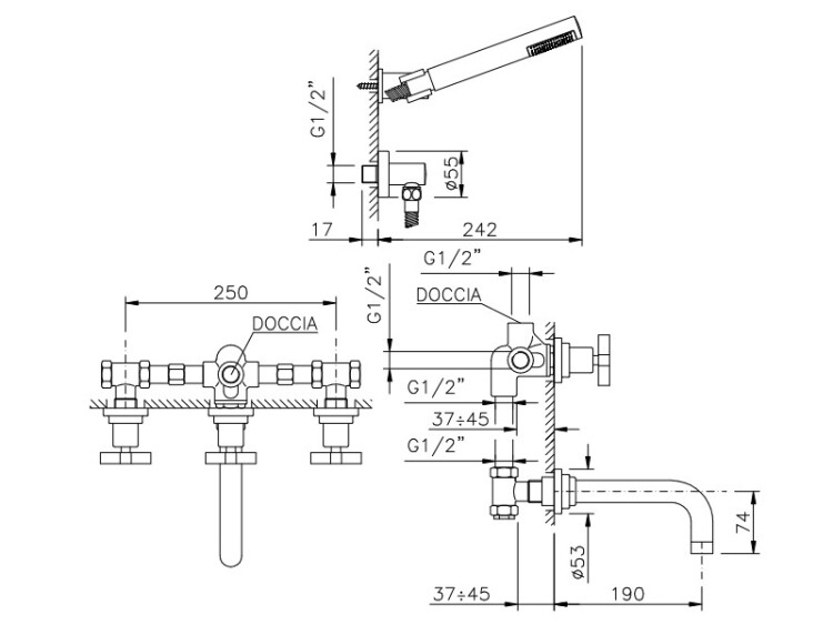 Смеситель для ванны и душа, Nicolazzi, Mac Kinley 05, тип открывания воды-двухрычажный, тип регулирования воды-керамический картридж, тип установки-встраиваемый, отверстия для монтажа-6, вынос излива, мм-190, вид ручки-29 Mac Kinley 05, цвет-Chrome, в комплекте-ручной душ, держатель ручного душа, форма цилиндрическая, переключатель, шланговое подключение Смеситель для ванны и душа, Nicolazzi, Mac Kinley 05, цвет-Chrome