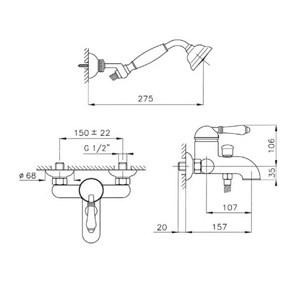 Смеситель для ванны и душа, Nicolazzi, P.M.Blanc, тип открывания воды-однорычажный, тип регулирования воды-керамический картридж, тип установки-настенный, отверстия для монтажа-2, вынос излива, мм-107, материал ручки-керамика, цвет ручки-бронза/белый, комплектация-ручной душ, цвет-бронза Смеситель для ванны и душа, Nicolazzi, P.M.Blanc, цвет-бронза