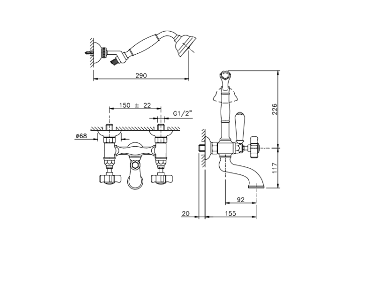 Смеситель для ванны и душа, Nicolazzi, P.M.Blanc, тип открывания воды-двухвентильный, тип установки-настенный, вынос излива, мм-92, комплектация-ручной душ, цвет-Bronze Plated Смеситель для ванны и душа, Nicolazzi, P.M.Blanc, цвет-Bronze Plated