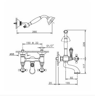 Смеситель для ванны и душа, Nicolazzi, P.M.Blanc, тип открывания воды-двухвентильный, тип регулирования воды-керамический картридж, тип установки-настенный, отверстия для монтажа-2, вынос излива, мм-92, материал ручки-керамика, цвет ручки-хром/белый, комплектация-ручной душ, цвет-хром Смеситель для ванны и душа, Nicolazzi, P.M.Blanc, цвет-хром