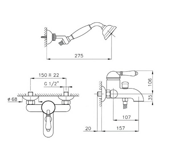 Смеситель для ванны и душа, Nicolazzi, P.M.Blanc, тип открывания воды-однорычажный, тип регулирования воды-керамический картридж, тип установки-настенный, отверстия для монтажа-2, вынос излива, мм-107, материал ручки-керамика, цвет ручки-хром/белый, комплектация-ручной душ, цвет-хром Смеситель для ванны и душа, Nicolazzi, P.M.Blanc, цвет-хром