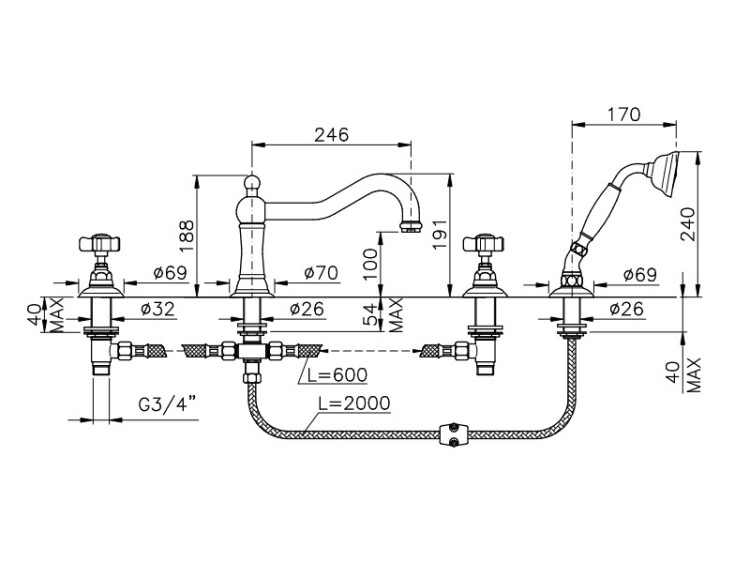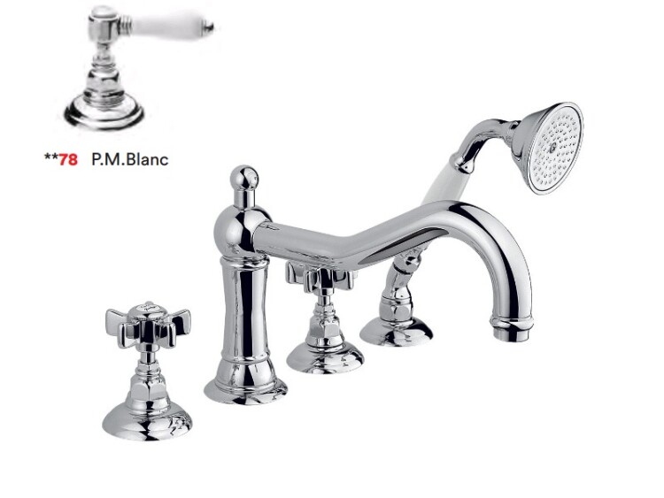Смеситель для ванны и душа, Nicolazzi, P.Mont Blanc, тип открывания воды-двухрычажный, тип регулирования воды-керамический картридж, тип установки-на борт ванны, отверстия для монтажа-4, вынос излива, мм-246, вид ручки-78 P.Mont Blanc, цвет-Chrome, 3/4", в комплекте-вытяжной ручной душ, форма-круглая Смеситель для ванны и душа, Nicolazzi, P.Mont Blanc, цвет-Chrome