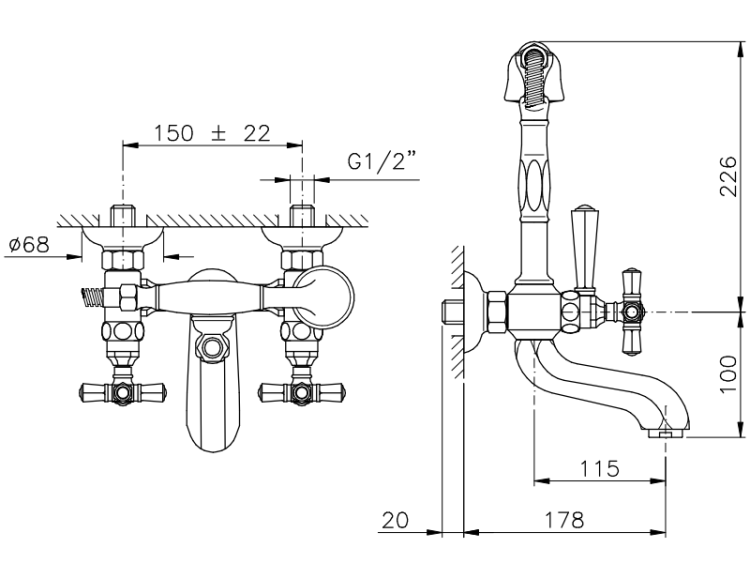 Смеситель для ванны и душа, Nicolazzi, Teide Metal, тип открывания воды-двухвентильный, тип регулирования воды-керамический картридж, тип установки-настенный, отверстия для монтажа-2, вынос излива, мм-115, вид ручки-05 Teide Metal, цвет-Bronze Plated, в комплекте-ручной душ, форма душевой лейки-круглая, держатель ручного душа, переключатель Смеситель для ванны и душа, Nicolazzi, Teide Metal, цвет-Bronze Plated