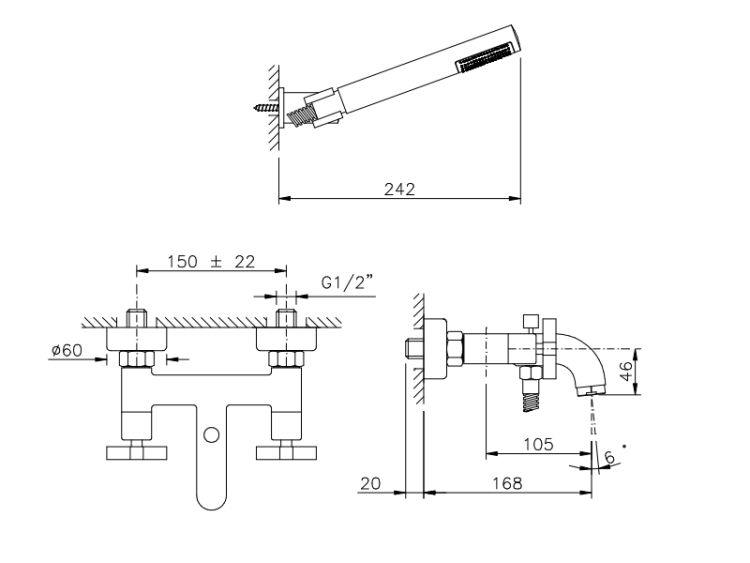 Смеситель для ванны, Nicolazzi, M.Croce, тип открывания воды-двухвентильный, тип установки-настенный, отверстия для монтажа-3, вынос излива, мм-168, комплектация-ручной душ, цвет-хром Смеситель для ванны, Nicolazzi, M.Croce, цвет-хром
