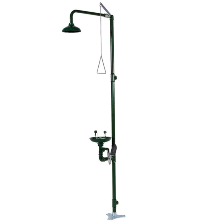 Аварийный душ с раковиной для промывки глаз, Nofer, с мгновенным автоматическим открытием и ручным закрытием с помощью жесткой тяги с треугольной рукояткой, а также с автоматическим приводом с большим потоком при низком давлении с помощью бокового рычага. верхний душ-есть, форма верхнего душа-круглая, держатель верхнего душа-есть, размер штанги, мм-2150, материал-оцинкованная сталь/полипропилен, цвет-зелёный Аварийный душ с раковиной для промывки глаз, Nofer, цвет-зелёный