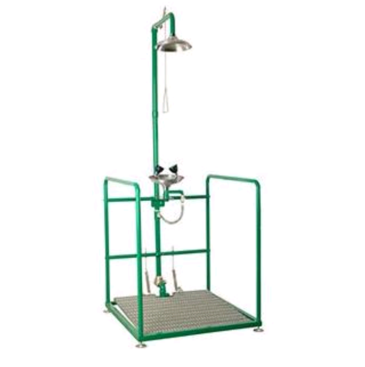 Аварийный душ с раковиной для промывки глаз, Nofer, размеры-2150*975 мм, раковина-260 мм (диаметр), предназначен для заводов, фабрик, лабораторий, где есть риск нанесения здоровья рабочему персоналу от огня, кислот, и прочих химических или радиоактивных реагентов, приводится в действие с помощью треугольного рычага или напольной педали, нержавеющая сталь Аварийный душ с раковиной для промывки глаз, Nofer, нержавеющая сталь