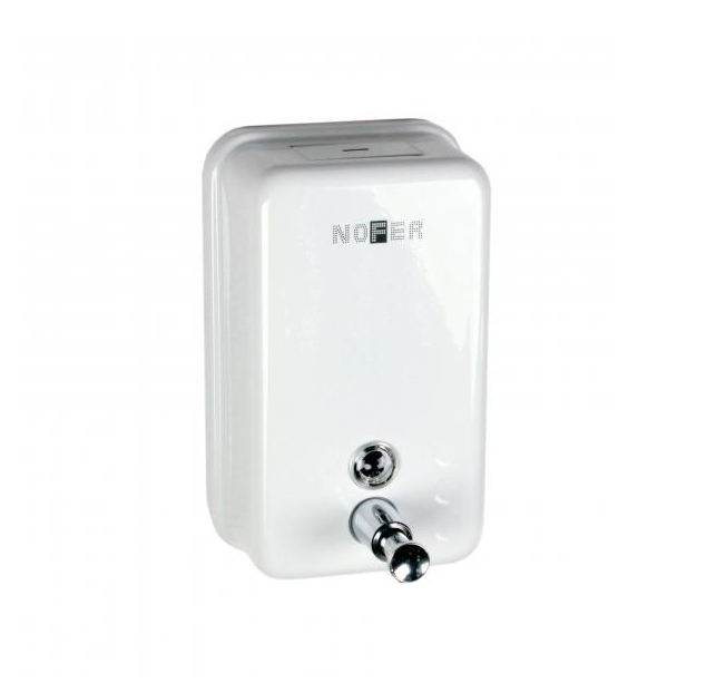 Диспенсер для мыла, Nofer, механический (нажимной), ширина, мм-121, глубина, мм-70, высота, мм-210, ёмкость(мл)-1200, тип установки-настенный, материал колбы-нержавеющая сталь, цвет колбы-белый, цвет дозатора-белый Диспенсер для мыла, Nofer, шгв 121*70*210, цвет дозатора-белый