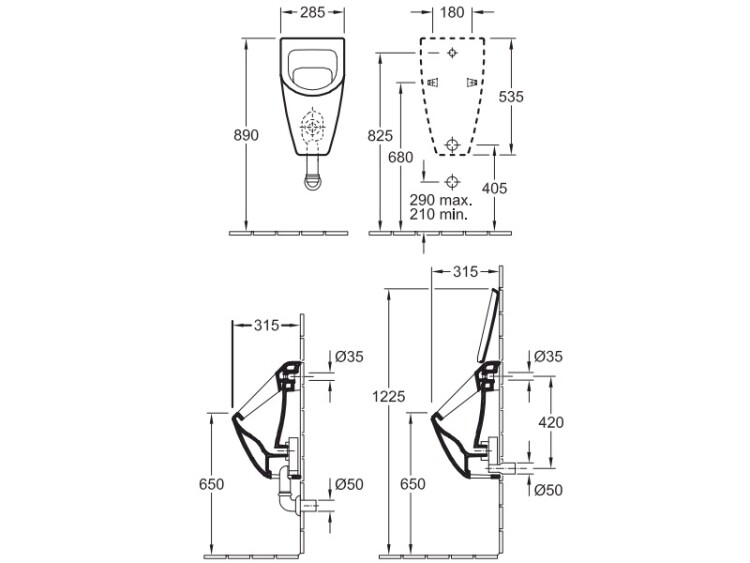 Писсуар, Villeroy&Boch, Subway, тип установки-подвесной, ширина, мм-285, глубина, мм-315, высота, мм-535, подвод воды-скрытый, сифон-необходимо заказать, материал-санфарфор, крепления в комплекте, цвет-альпийский белый, с отверстиями для крепежа крышки Писсуар, Villeroy&Boch, Subway, шгв 285*315*535, цвет-альпийский белый