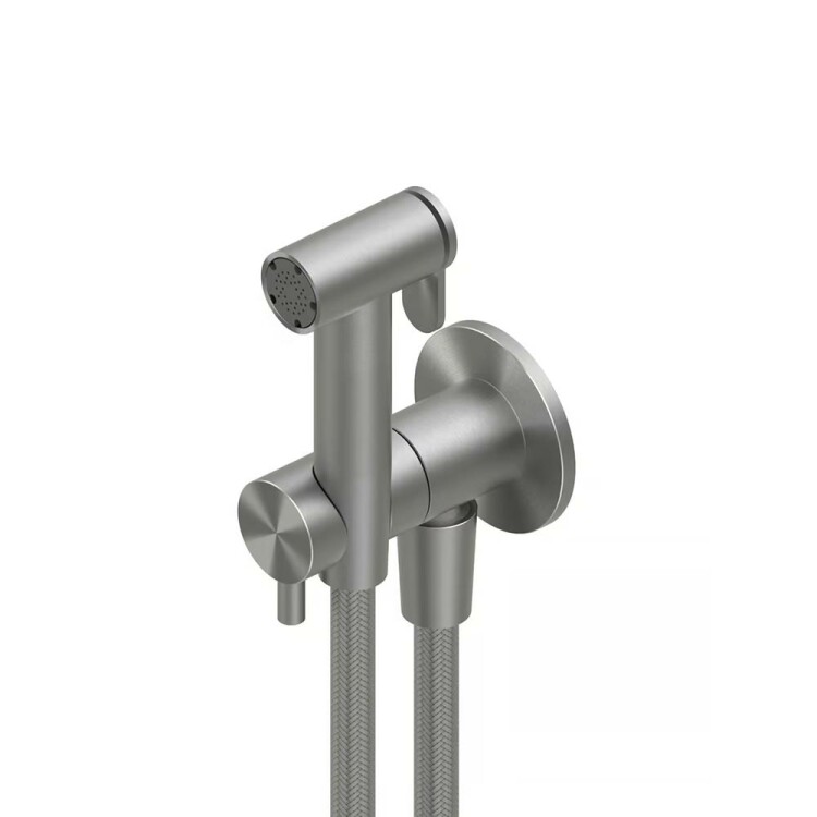 Гигиенический душ, Quadro design, Complements, с запорным вентилем, держатель с шланговым подсоединением-в комплекте, цвет-сталь брашированная Гигиенический душ, Quadro design, Complements, цвет-сталь брашированная