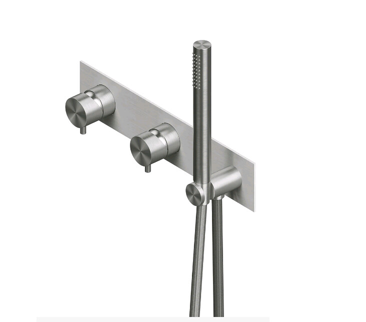 Смеситель для душа, Quadro design, Source, на 2 потребителя, тип открывания воды-однорычажный, тип регулирования воды-керамический картридж, монтаж-настенный встраиваемый, отверстия для монтажа-3, в комплекте-ручной душ, внутренняя часть-необходимо заказать, цвет-сталь шлифованная/брашированная (Steel Brushed) Смеситель для душа, Quadro design, Source, на 2 потребителя, цвет-сталь шлифованная/брашированная (Steel Brushed)