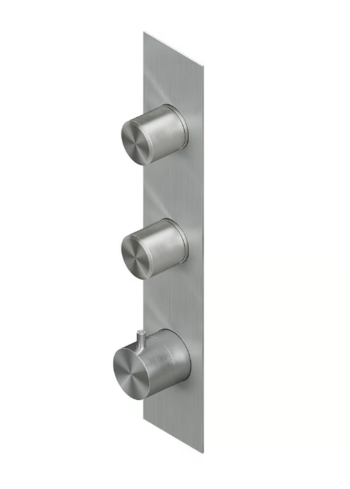 Смеситель для душа, Quadro design, Stereo, на 2 потребителя, тип открывания воды-вентильный, 2 запорных вентиля, тип регулирования воды-термостатический картридж, монтаж-настенный встраиваемый, отверстия для монтажа-3, внутренняя часть-в комплекте, материал-нержавеющая сталь AISI316L, цвет-сталь брашированная Смеситель для душа, Quadro design, Stereo, на 2 потребителя, цвет-сталь брашированная