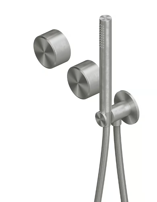 Смеситель для душа, Quadro design, Stereo, на 2 потребителя, в составе-2 смесителя, тип открывания воды-одновентильный, тип регулирования воды-прогрессивный картридж, монтаж-настенный встраиваемый, отверстия для монтажа-3, внутренняя часть-2 штуки необходимо заказать, в комплекте-ручной душ, шланг, шланговое подсоединение с держателем, материал-нержавеющая сталь AISI316L, цвет-сталь брашированная Смеситель для душа, Quadro design, Stereo, на 2 потребителя, цвет-сталь брашированная