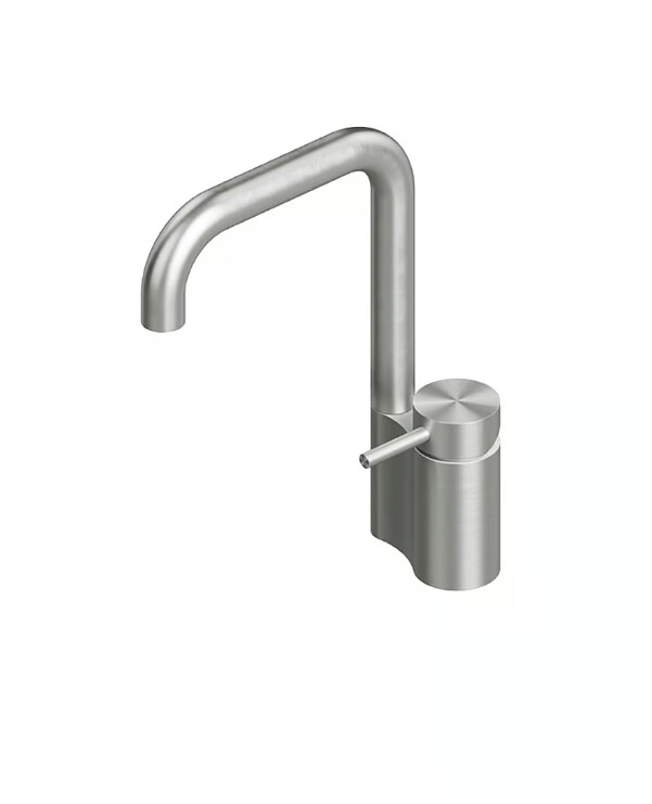 Смеситель для раковины, Quadro design, Ottavo, тип открывания воды-однорычажный, тип регулирования воды-керамический картридж, монтаж-на раковину/столешницу, отверстия для монтажа-1, высота, мм-244, вынос излива, мм-150, стандарт подвода воды-3/8", цвет-сталь брашированная Смеситель для раковины, Quadro design, Ottavo, цвет-сталь брашированная