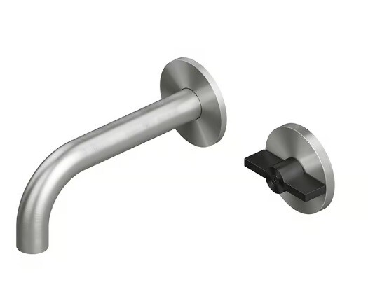 Смеситель для раковины, Quadro design, Valvola01, тип открывания воды-вентильный, тип регулирования воды-прогрессивный картридж, монтаж-настенный встраиваемый, отверстия для монтажа-2, высота, мм-63, вынос излива, мм-190, тип излива-неподвижный, цвет ручки-золото черное, тип подводки-жесткая, стандарт подвода воды-1/2", внутренняя часть-необходимо заказать, цвет смесителя-сталь брашированная Смеситель для раковины, Quadro design, Valvola01, цвет-сталь брашированная/золото черное