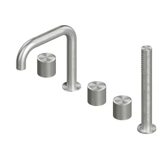 Смеситель для ванны и душа, Quadro design, Stereo, тип открывания воды-вентильный, тип регулирования воды-прогрессивный картридж, монтаж-на борт ванны, отверстия для монтажа-5, вынос излива, мм-161, тип излива-поворотный, ручной душ-в комплекте, материал-нержавеющая сталь AISI316L, цвет-сталь брашированная Смеситель для ванны и душа, Quadro design, Stereo, цвет-сталь брашированная